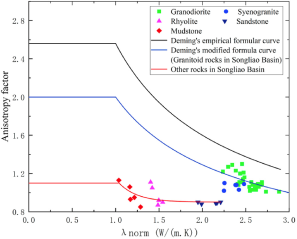 The distribution range of thermal conductivity and anisotropy factor of different types of rock samples were further measured, and the characteristics of thermal conductivity anisotropy of different types of rocks were summarized. At the same time, a correction equation for the anisotropy factor of thermal conductivity of different types of rocks in Songliao Basin was proposed.
