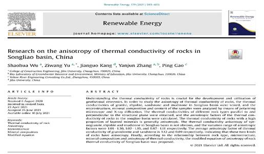 In July 2021, Associate Professor Yu Zimang’s team from College of Construction Engineering of Jilin University published a paper entitled “Research on the anisotropy of thermal conductivity of rocks in Songliao basin, China” in the international famous academic journal Renewable Energy, which is of great significance for the development of geothermal energy in the study area.
