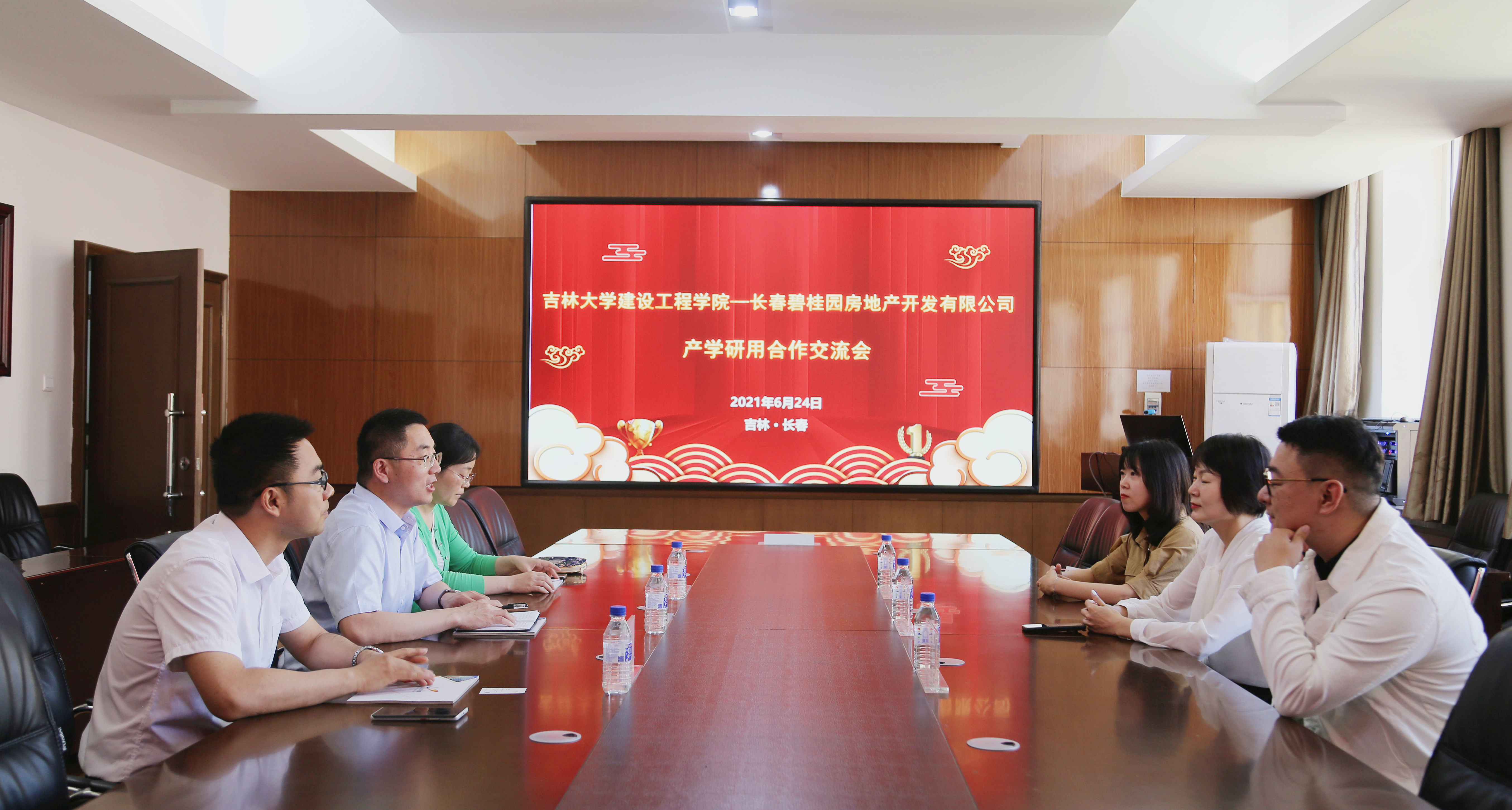 On the morning of June 24, the College of Construction Engineering of Jilin University and Changchun Country Garden Real Estate Development Co. Ltd. (Changchun Country Garden / the Company) held an industry-university-research-application cooperation exchange meeting at Meeting Room 319, Shuigong Building on Chaoyang Campus. The attendees include An Liya-Head of the Human Resources Department, Fan Shuangshuang-Recruitment Manager, and Xu Bo-Administrative Manager from Changchun Country Garden Real Estate Development Co. Ltd., the Deputy Dean Wang Boxin and Deputy Dean Cao Pinlu of the College of Construction Engineering, as well as Zhu Shan, the director of Department of Construction Engineering.