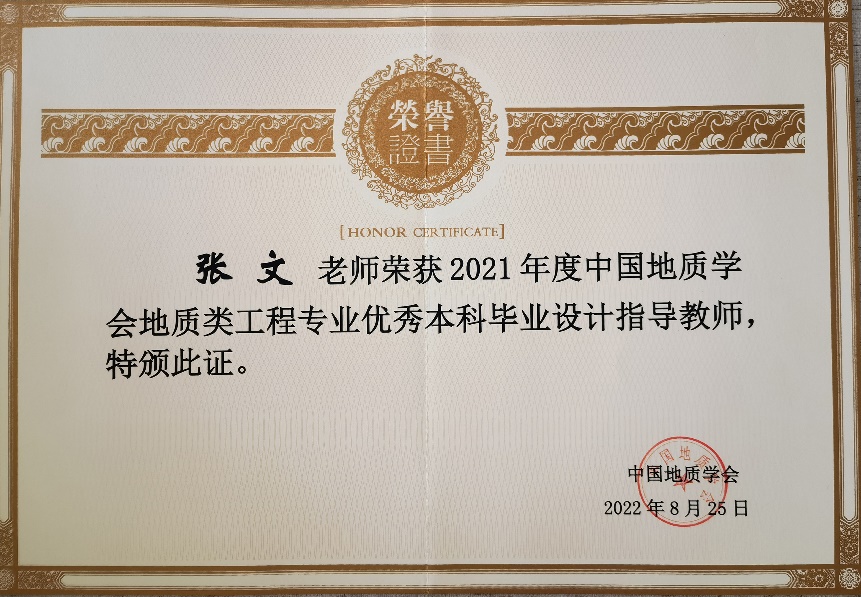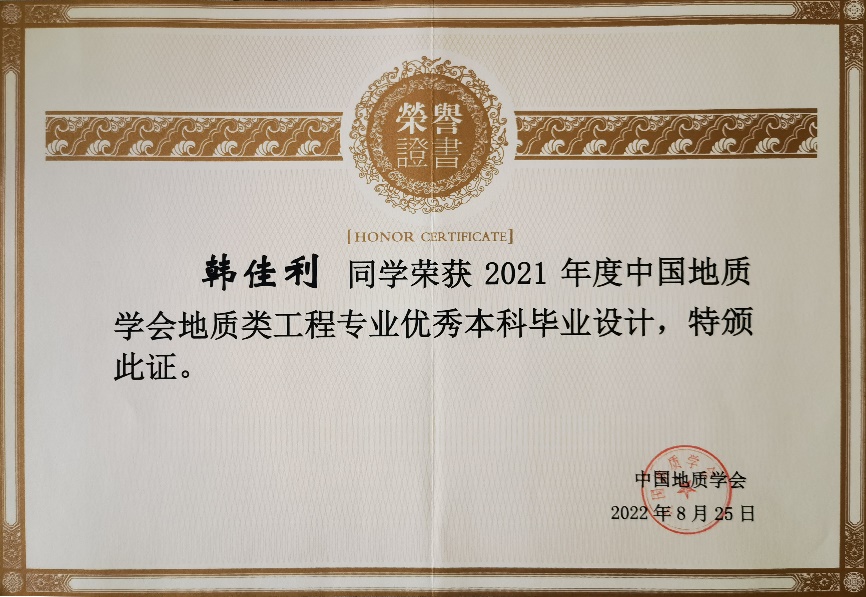 Since 2019, the Geological Society of China has been promoting innovative engineering education concepts, inspiring guidance teachers and students majoring in geological engineering to actively participate in the graduation design process, effectively improving the teaching and graduation design quality of geological engineering education, promoting the high-quality development of engineering education professional certification, and carrying out the selection of outstanding undergraduate graduation designs in geological engineering. In total, 5 undergraduate graduation designs from the College of Construction Engineering majoring in Geological Engineering were awarded as outstanding undergraduate graduation designs.