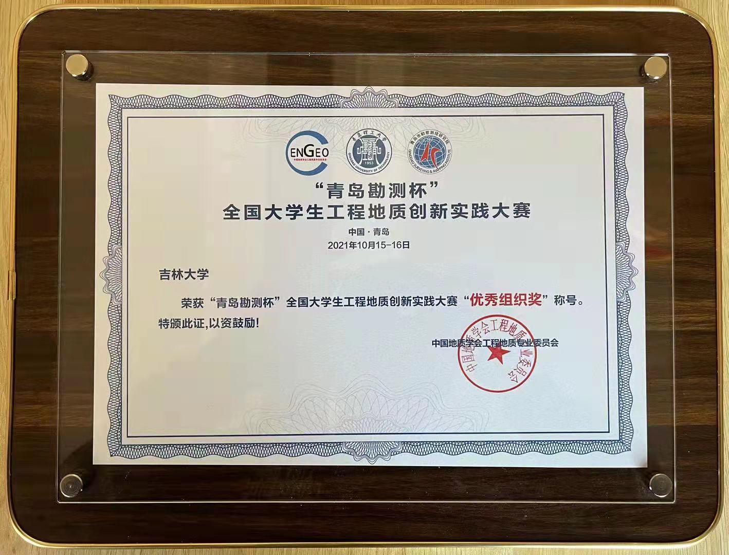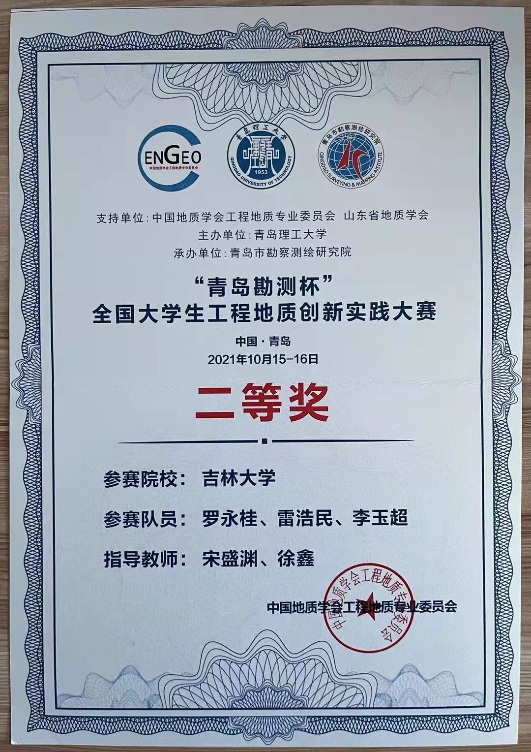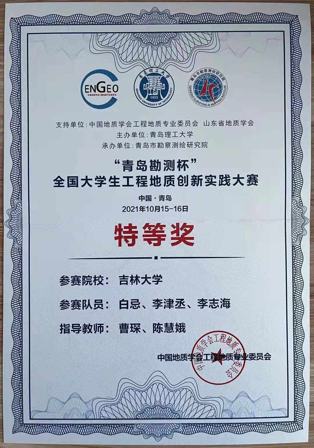 On October 15th, 2021, the First National Student Engineering Geology Innovation and Practice Competition was held in Qingdao. The group of Bai Ji, Li Jincheng and Li Zhihai, jointly supervised by Cao Chen and Chen Hui’e, won the special prize of the competition; the group of Luo Yonggui, Lei Haomin and Li Yuchao, jointly supervised by Song Shengyuan and Xu Xin, won the second prize of the competition.