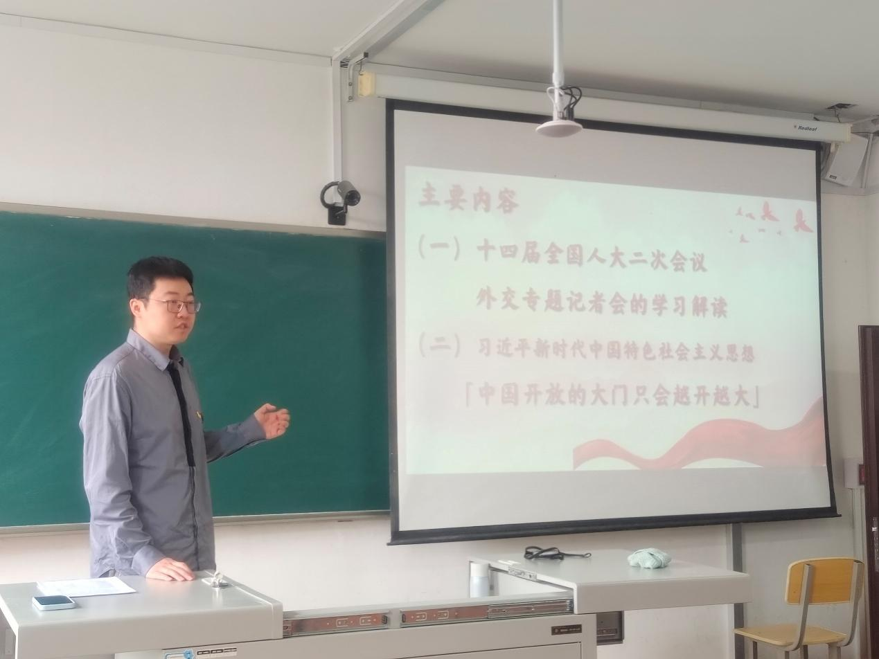 最后,主讲人以习近平新时代中国特色社会主义思想为切入点,带领同学们回顾了我国多年来“开放”的历史,并解读我国当前“开放”的政策。党课最后,主讲人援引习近平总书记在广东考察时的讲话“中国改革开放政策将长久不变,永远不会自己关上开放的大门。一切愿意与我们合作共赢的国家,我们都愿意与他们相向而行,推动世界经济共同繁荣发展。”,以此引领同学们对于我国开放合作外交的美好前景进行了展望。