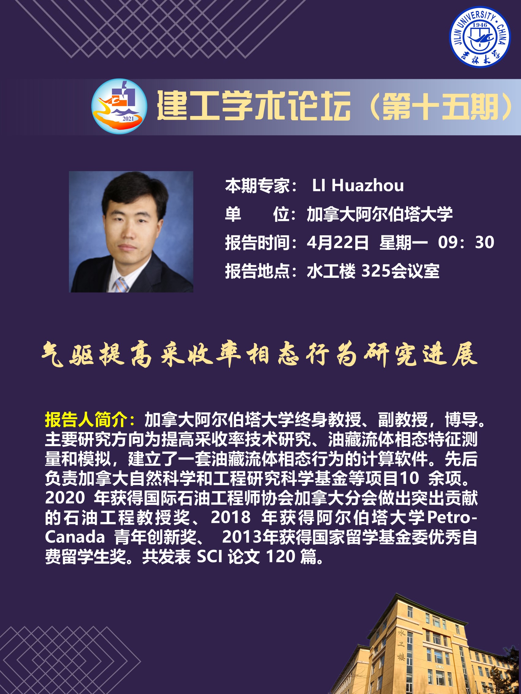 LI Huazhou现任加拿大阿尔伯塔大学终身教授、副教授,博导。主要研究方向为提高采收率技术研究、油藏流体相态特征测量和模拟,建立了一套油藏流体相态行为的计算软件。先后负责加拿大自然科学和工程研究科学基金等项目10 余项。2020 年获得国际石油工程师协会加拿大分会做出突出贡献的石油工程教授奖、2018 年获得阿尔伯塔大学Petro-Canada 青年创新奖、 2013年获得国家留学基金委优秀自费职工奖。共发表 SCI 论文120 篇。