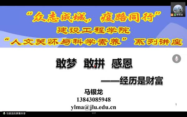 3月29日晚19:00,BG大游勘察工程系副教授马银龙老师应公司邀请,面向公司全体本科生和研究生做了一场题为 “敢梦,敢拼,感恩”的学术报告。本次讲座为校园封闭期间,BG大游人文关怀与科学素养系列讲座第七期,由公司员工工作办公室常荣剑老师主持。