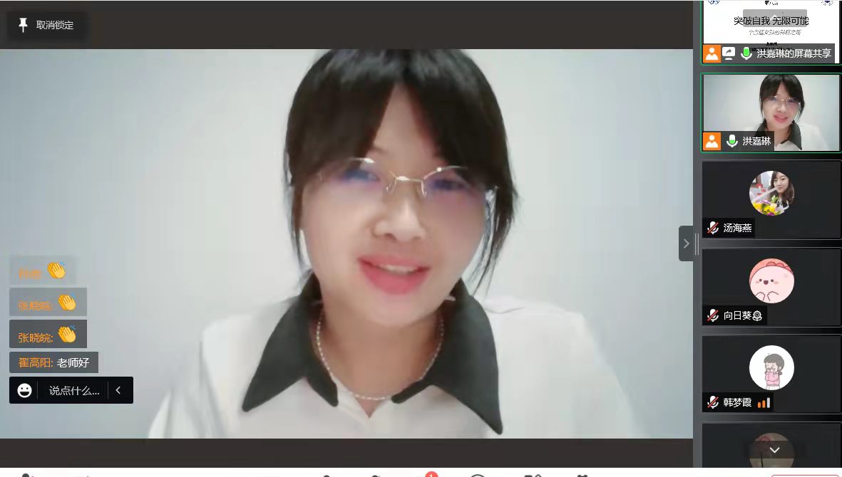 洪老师以亲身经历向大家讲述了一个普通女孩不普通的科研之路,机会总是留给有准备的人,同学们要在科研交流中留心建立联系,懂得展示自己的能力,为自己创造机会。洪老师鼓励同学们在疫情期间勤于思考,培养科研的兴趣,不断探索勇于突破,创造属于自己的成功之路!同学们在此次讲座中收获颇丰,纷纷表示期待与洪老师的再次会面,洪老师也分享了自己的联系方式,欢迎大家会后继续交流讨论,并与参会的老师和同学们线上合影留念。