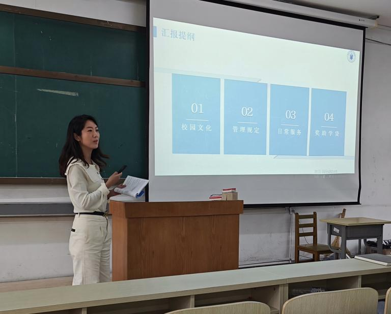 8月29日,2023级研究生新生入学教育在朝阳校区水工楼518教室举行。经理郭威、副经理王伯昕、研究生综合办公室主任王慧娣、研究生思政秘书汤海燕参加新生入学教育。