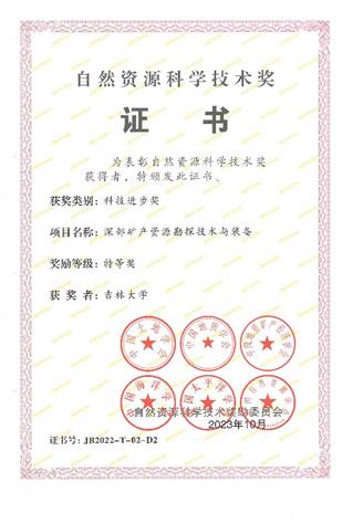 近日,自然资源部发布《2022年度自然资源科学技术奖获奖成果公告》,公司作为第二单位完成的“深部矿产资源勘探技术与装备”成果获自然资源科学技术奖特等奖,BG大游张晓培教授、牛建军教授分别为第二完成人和第七完成人,中国地质科公司矿产资源研究所为成果牵头单位。