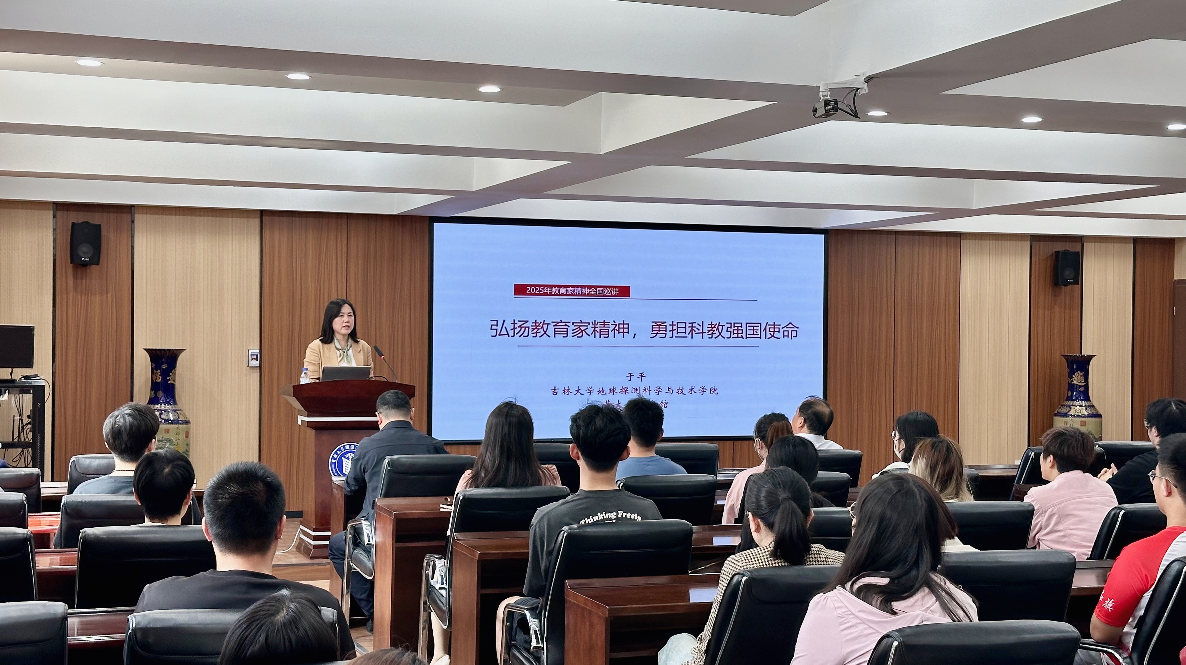 报告中,于平怀着无限崇敬和缅怀之情为师生们讲述了黄大年教授放弃海外优渥条件毅然归国,带领团队突破“巡天探地潜海”技术瓶颈的攻坚历程和奋斗人生,激励在场师生弘扬黄大年精神,汲取奉献担当的精神动力,铸就新时代高尚师魂,以实际行动推动高水平科技自立自强。当她深情讲述黄大年教授在重病中仍坚持指导员工论文、在手术前反复叮嘱员工要爱国报国等感人情节时,现场观众无不动容。