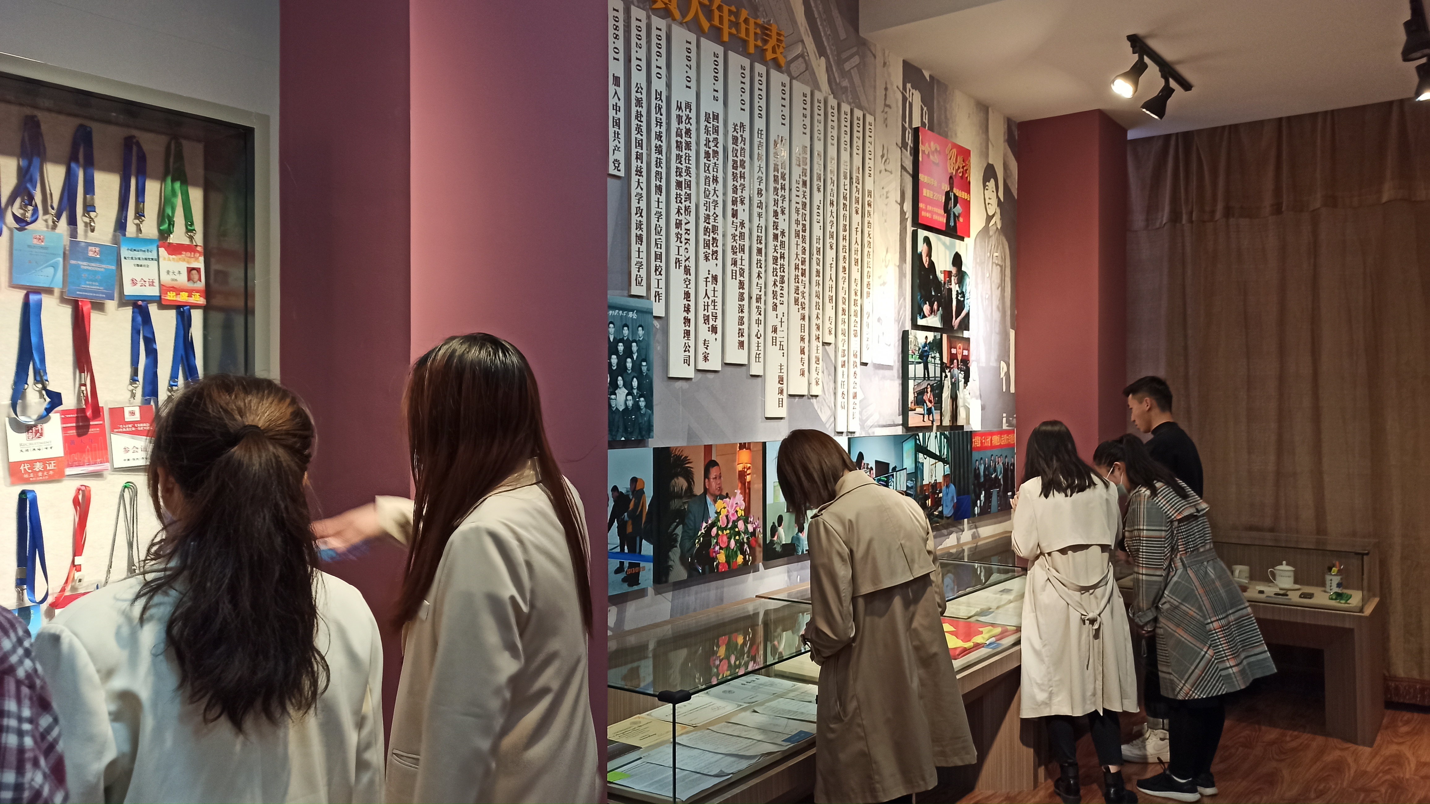 进入黄大年纪念馆,映入眼帘的是黄老师工作期间参加会议的一系列证件,全国优秀共产党员的证书、曾经盖在遗体上的鲜红党旗、学习工作时的笔记,使大家对黄老师的敬佩之情油然而生。走入隔壁黄大年老师生前的办公室,陈列十分简单,墙上写满小字的日程表吸引了大家,看到黄老师排得如此紧密的日程,我们感受到了黄老师的敬业精神。